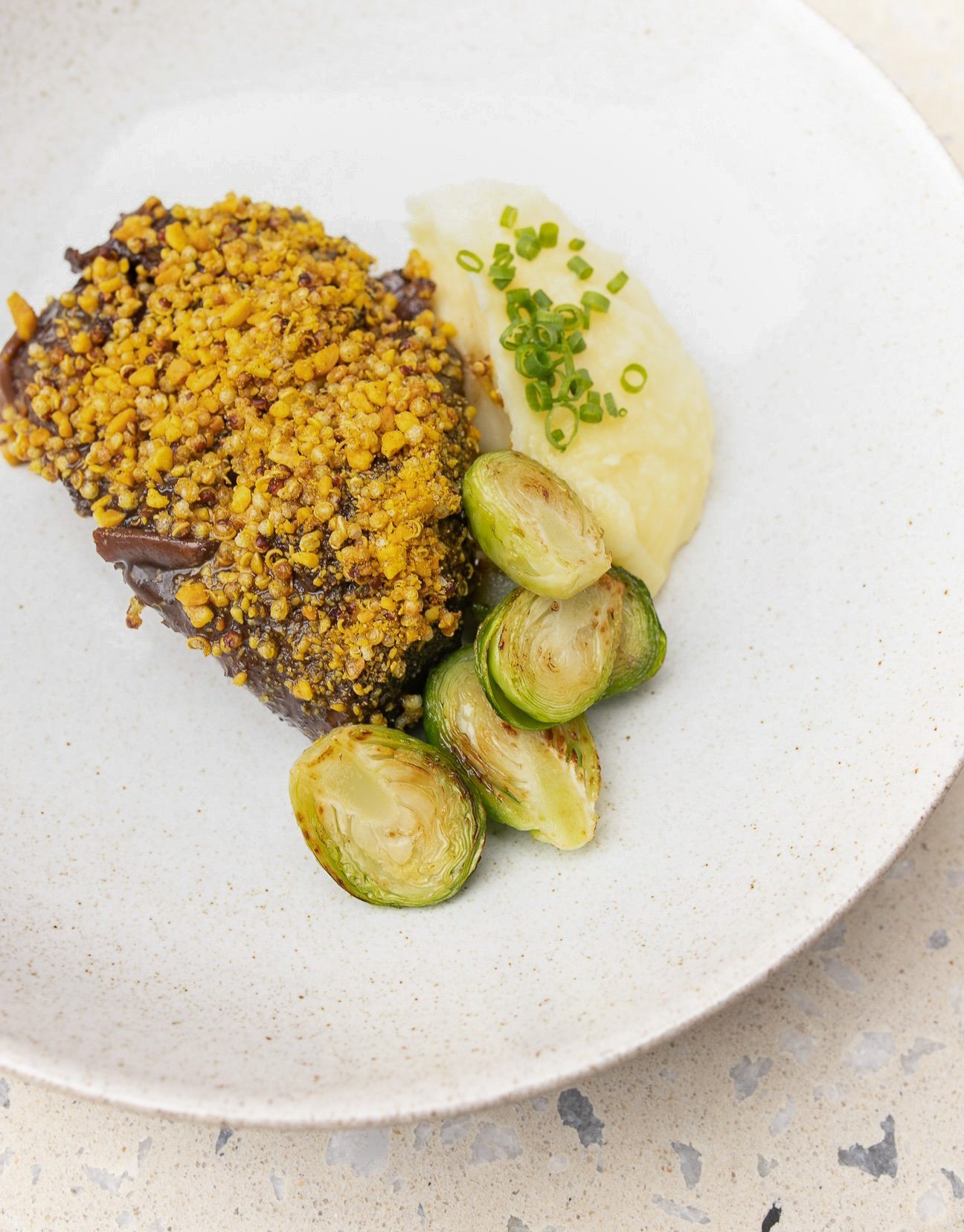 ТЕЛЯЧЬИ ЩЕЧКИ С КАРТОФЕЛЬНЫМ ПЮРЕ И БРЮССЕЛЬСКОЙ КАПУСТОЙ